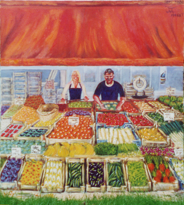Vader en dochter op dit schilderij hebben samen jarenlang deze groentemarkt gehad.