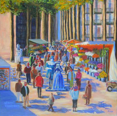 Omschrijving: Geinspireerd door de Ramblas in Barcelona met al zijn " menselijke standbeelden" en daardoor aparte atmosfeer. Sommigen heel vermakelijk, zoals de" heer op de pot" links, anderen leuk door hun "uitdossing en bewegingen" als van een "oude mechanische pop", weer anderen fantastisch "gesminkt". Ook het stilstaan als een standbeeld zelfs zonder te knipperen met de ogen minuten lang is interessant om naar te kijken. Meer achter in het schilderij zijn er ook nog 3 te zien. Een prachtige dame, als standbeeld aan de ingang van een feest riep de vraag op of ze echt was of een pop.Een heer zei: dat weet je heel snel en gooide een glas champagne in haar decolete, ze bleek "echt".