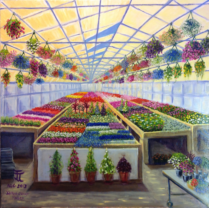 | Titel: Jufferstraat kwekerij Datum: Augustus 2013 Techniek: Olieverf op canvas Afmetingen: 100x100 cm